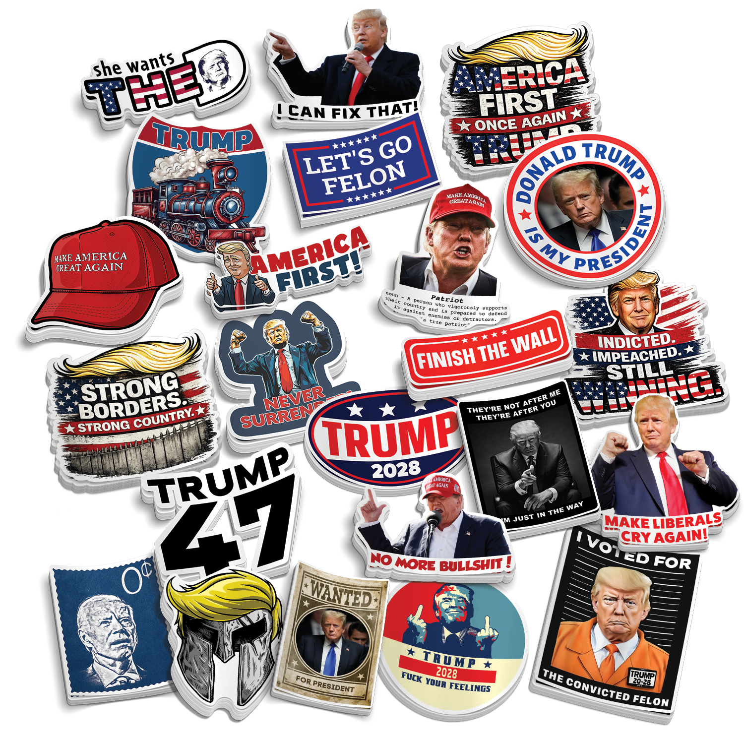 Whether you're a dedicated supporter or simply appreciate unique political memorabilia, our 32 Piece Trump Sticker Pack offers a diverse range of designs.